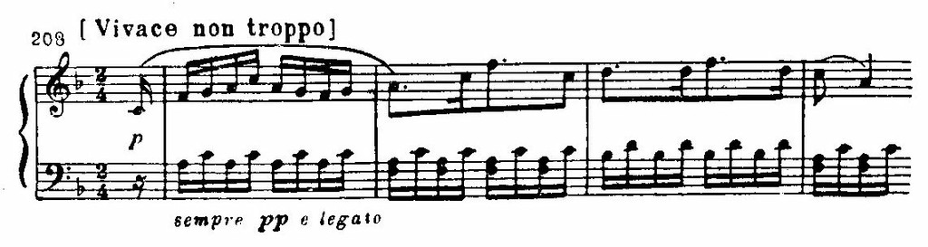 Солирующий кларнет подражает тембру шотландской волынки — bag-pipe (известно, что во время пребывания в Шотландии Мендельсон присутствовал на состязании народных дудочников). По мере развития темы ее народный ладовый колорит затушевывается, но хороводный характер музыки выдержан до конца. Радужное скерцо с его тонкой и яркой игрой оркестровых и гармонических красок контрастирует с сумрачной инструментовкой и романсной чувствительностью других частей симфонии.