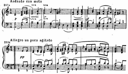 (Так, например, тема вступления «Шотландской симфонии» напоминает по своему интонационному складу тему из Andante шубертовской С-dur'ной симфонии, главную тему фортепианного концерта Шумана и тему «Романса» из Четвертой симфонии Шумана. Заключительная тема «Шотландской симфонии» имеет много общего с темой побочной партии Девятой симфонии Шуберта. Сходные романсные интонации ощутимы в Четвертой симфонии Брамса и т. д.)