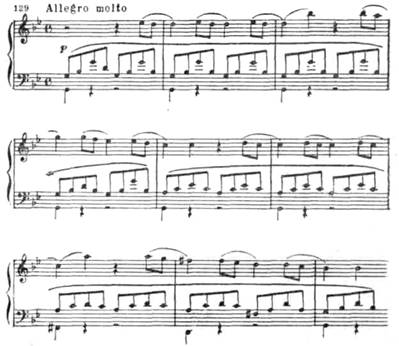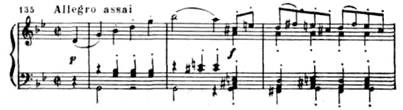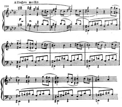 Все темы этой части (главная, связующая и побочная партии) объединяются характерной фигурой из тридцатьвторых, получающей интенсивное драматическое развитие в разработке.