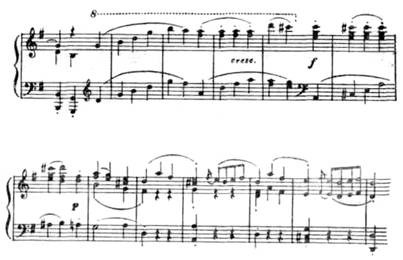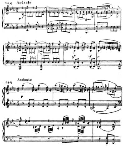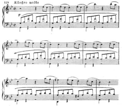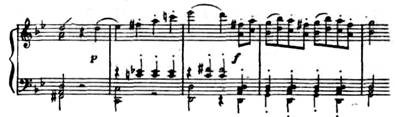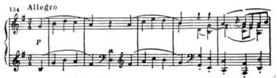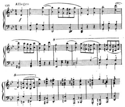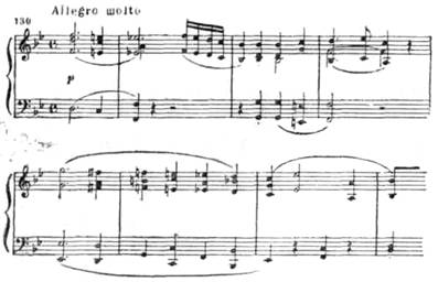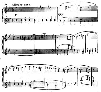 Новая ладовая окраска этой темы (параллельный мажор), иная фактура, иной тип мелодии (в первой теме после секундовой «раскачки» восходящее движение на сексту, здесь же вся тема движется поступенно или хроматически в более узком диапазоне) — все это придает ей контрастный характер.