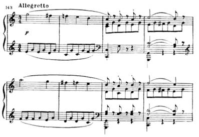 Эта же тема лежит в основе связующей партии, особенно ее второй элемент, получающий секвенционное развитие. В доминантовой тональности (соль мажор) написана побочная партия — легкая, подвижная, как бы парящая: