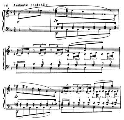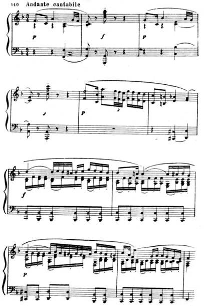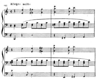 Особенно драматична связующая партия с ее минорным ладом, синкопами, пульсирующими триолями, уменьшенными гармониями: