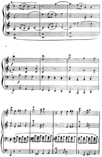 Таков первый раздел разработки. Во втором разделе получают развитие оба элемента главной партии, до установления доминантового органного пункта, постепенно подводящего к репризе. В репризе излагаются все три темы в той же последовательности, но в основной тональности до мажор. Тональная устойчивость репризы полностью компенсирует неустойчивость разработки.