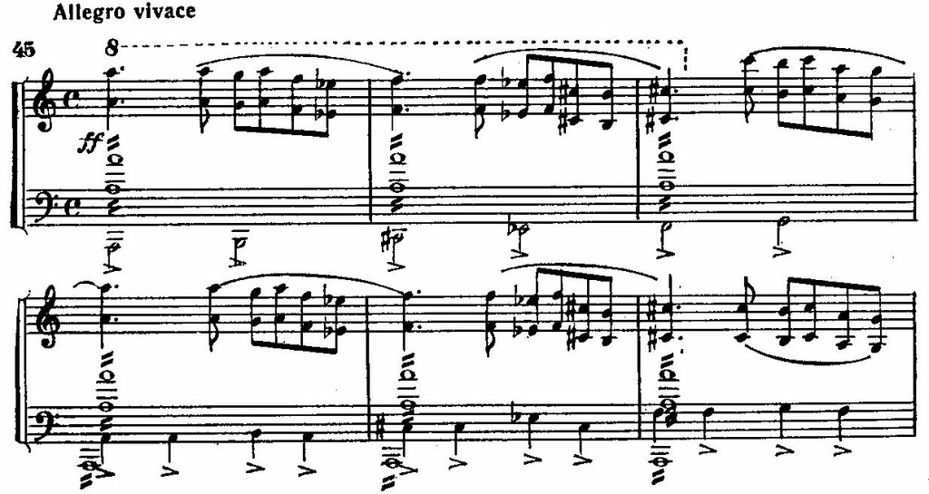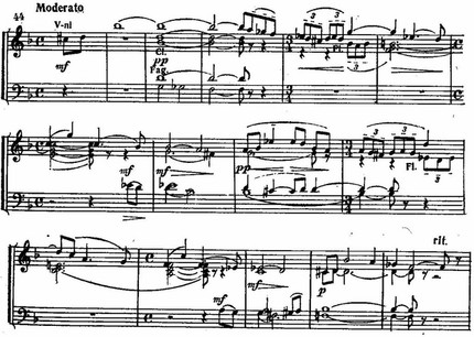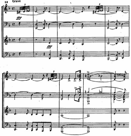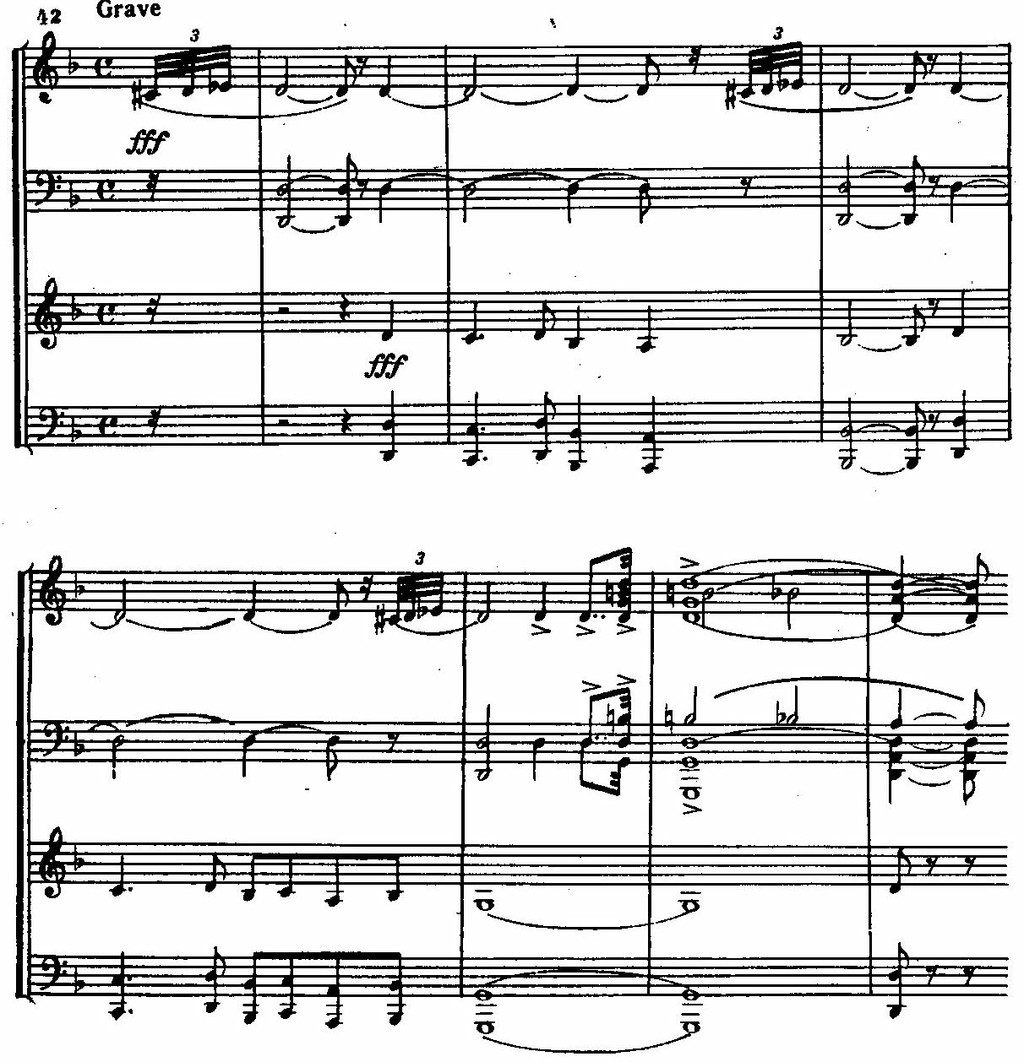 В главной партии грозный эпический мотив вступления приобретает взволнованную, трепетно-лирическую окраску. Его дополняет глухо звучащая в басу ответная фраза, основанная на тех же интонационно-ритмических элементах: