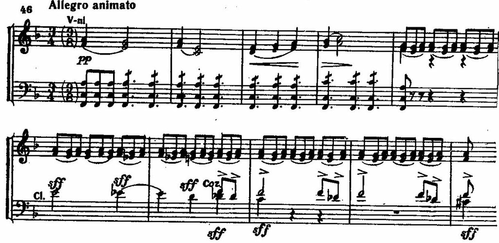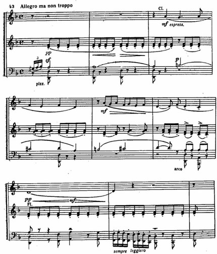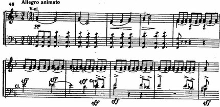 Этот мотив в разнообразных преломлениях непрерывно возникает на протяжении всей части. Он то незаметно вплетается в музыкальную ткань, то звучит настойчиво и повелительно, как будящий тревожный клич.