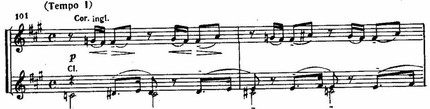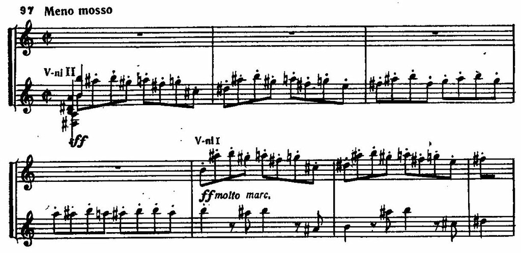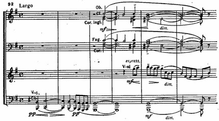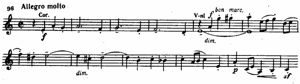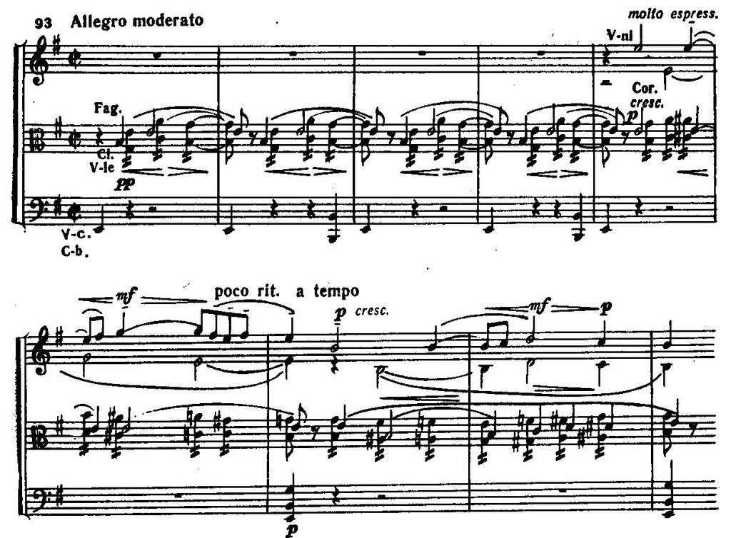 Но эта героическая кульминация непродолжительна, и после нескольких тактов наступает срыв, вслед за которым в разных голосах оркестра раздаются призывные фанфарные фразы, соединяющиеся с драматическими «стонущими» интонациями скрипок.