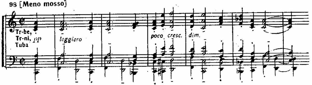 Светлый контраст вносит лирическая певучая тема в середине крайних разделов сложной трехчастной формы. Но это только кратковременный проходящий эпизод. Особенно заостряются злые и жутко-таинственные образы в среднем разделе скерцо (Мепо mosso), где происходит как бы расщепление двух начал, соединяющихся в основной теме этой части. Из второго построения ее вырастает «колючая» кружащаяся фигура, последовательное проведение которой в разных голосах наподобие фугато напоминает фантастический хоровод каких-то причудливых масок (Здесь возникают и пейзажные ассоциации, до известной степени родственные среднему разделу кантаты «Весна»: образы зимней вьюги, вихрящегося снежного круговорота.):
