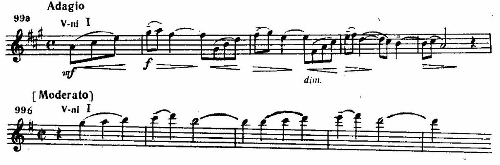 Третья часть симфонии — Adagio —одна из поэтических страниц светлой рахманиновской лирики. По характеру музыки и даже отдельным мелодическим оборотам она близка к таким лирическим романсам Рахманинова, как «Здесь хорошо», «У моего окна», некоторые черты сходства есть в ней и с средней частью Второго фортепианного концерта. В Adagio, интонационно связанном с темами первой, а до известной степени и второй части, получает наиболее полное, концентрированное выражение сфера лирических образов симфонии. Особое значение имеет вступительная фраза (пример 99 а), которая несколько раз повторяется на протяжении Adagio в кульминационных моментах развития и на рубежах музыкальной формы. Эта фраза вырастает из секвенционного построения, встречавшегося в побочной партии первой части при подходе к мелодической кульминации (пример 99 б):