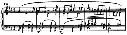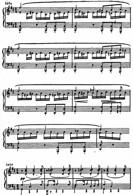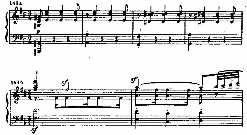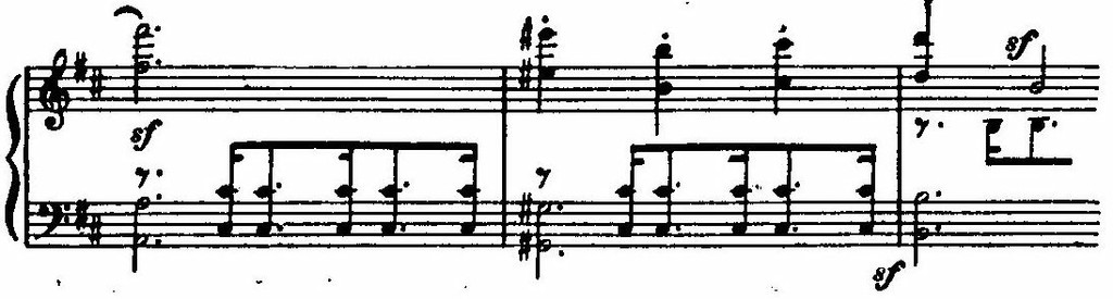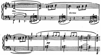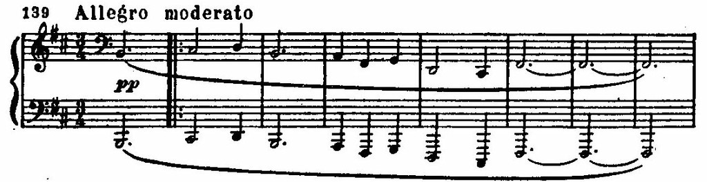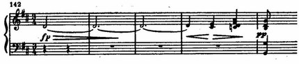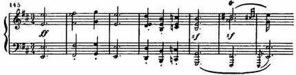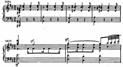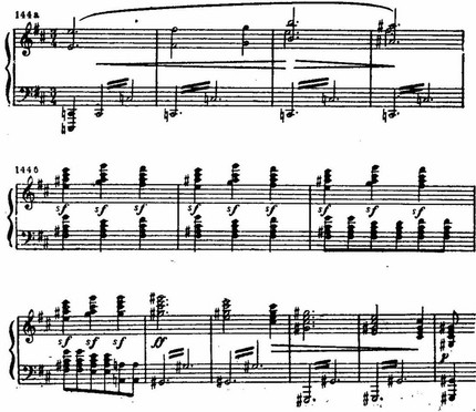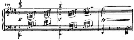 На этом фоне поднимается цепь восходящих секвенций, построенных на интонациях той же темы. В движении секвенций с имитационно переплетающимися мотивами вскрывается их внутренняя драматическая страстность. В момент первой кульминации напряжение разряжается взрывом всего оркестра: