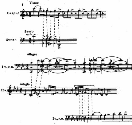 Такими чертами отмечена тема-тезис, тема-эпиграф Четвертой симфонии: короткая, раскручивающаяся как пружина, сочетающая чистые интервалы и тритон (это «лейтинтервал» зрелого Танеева), а в скрытом виде — уменьшенную терцию. Ее смысл и значение невозможно понять вне тематического контекста симфонии в целом. Интонации ее участвуют в строительстве других тем. Противостоит ей побочная тема — светлая, мечтательная. И обе они входят в тему Adagio, придавая ей огромный обобщающий смысл. Разнообразными способами (мелодическая и ритмическая вариантность, обращения и т. п.) связаны воедино многие темы симфонии, что отчасти отражено в приводимом примере 4.