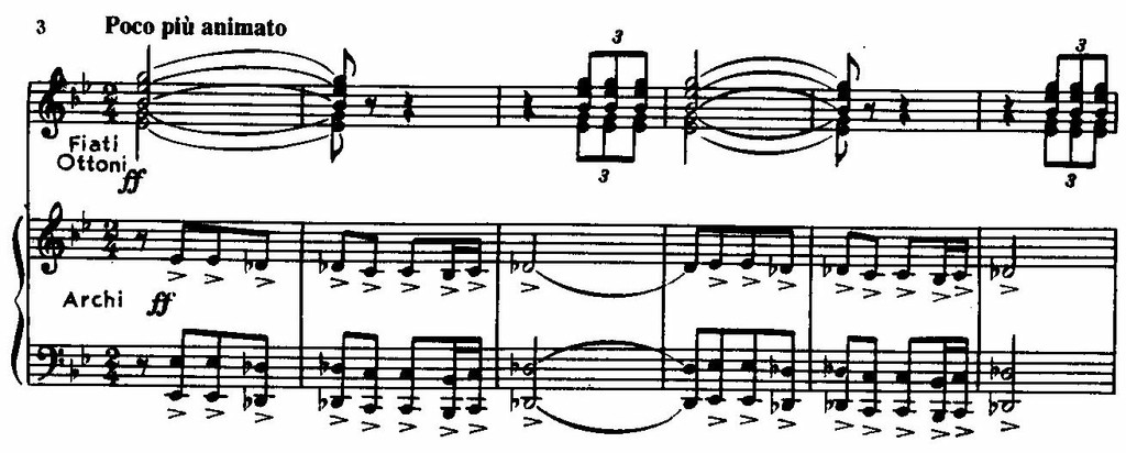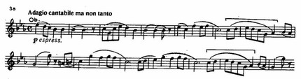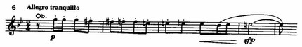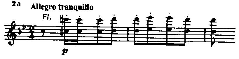 и вызывает ощущение незавершенности, настоятельно требующей продолжения и развития. Во втором предложении тема, данная в ином тембровом оформлении (альты вместо флейты и фагота), сопровождается острой «колючей» фигуркой у флейты,