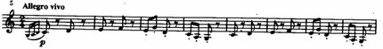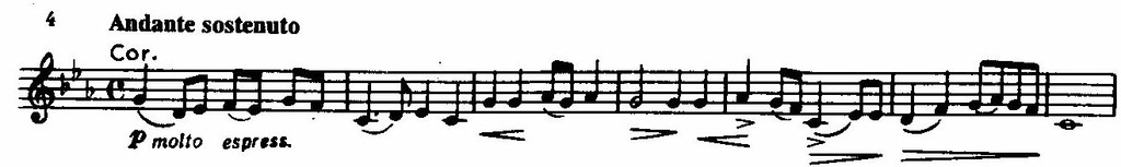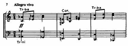Непосредственно перед переходом к побочной партии в массивном басовом голосе при звучании оркестра tutti ff возникает полный целотонный звукоряд, тогда как начальный отрезок темы в изложении валторн и труб приобретает характер торжественной призывной фанфары.