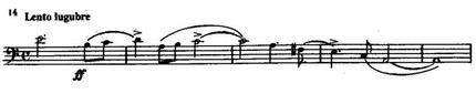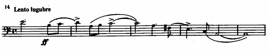 Более настойчиво звучит интонационно родственная ей вторая тема в октавном изложении струнных с контрапунктом низких деревянных и медных, но и она оканчивается так же вопросительно неустойчиво.