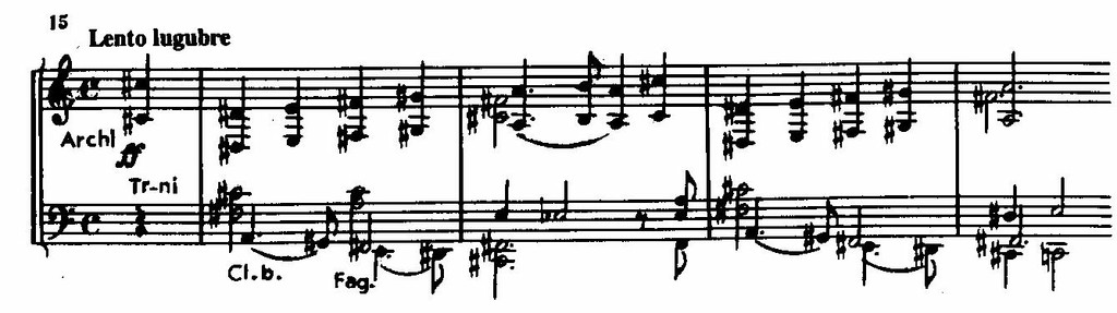 Первая тема, устремленная вниз, представляет собой напряженный монолог низких деревянных (бас-кларнет и 3 фагота), будто подхлестываемых резкими аккордами низких струнных. Вторая тема (струнные в унисон) упорно стремится вверх, несмотря на сдерживающие, направленные вниз подголоски и неустойчивые гармонии. Третья тема — с пунктирным ритмом, интонациями стона, вздоха, на беспокойном триольном фоне. Развиваясь, варьируясь, они чередуются, достигая кульминации, в которой слышится отчаяние. Это портрет главного героя.