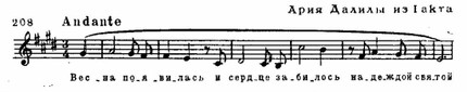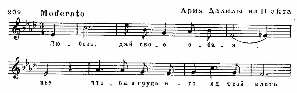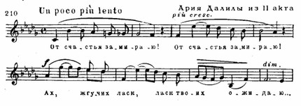 Драматургическая вершина оперы — большой дуэт с Самсоном (обрамлен темой грозы в оркестре). Развернутая диалогическая сцена имеет несколько разделов; один из них образует третья ария Далилы, ставшая очень популярной на концертной эстраде — «Открылася душа» (Des-dur). Здесь сосредоточено все наиболее характерное (ср. пример 208), что присуще музыкальной характеристике героини: