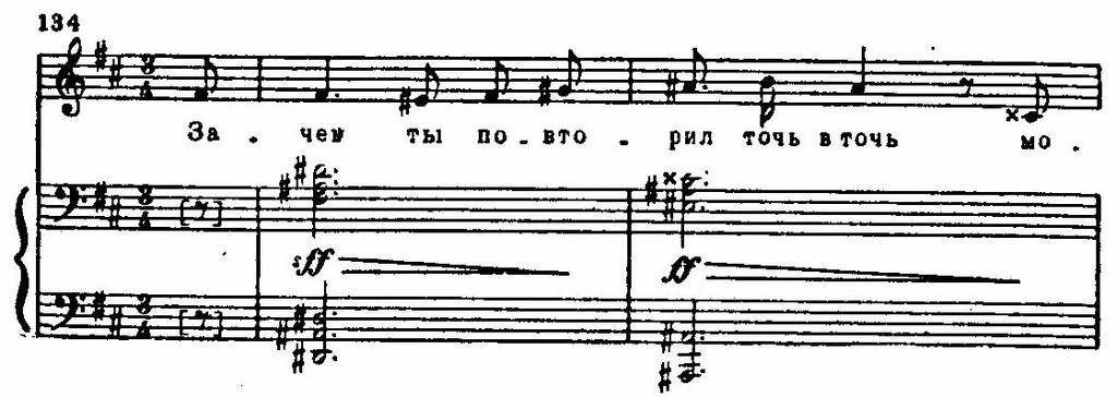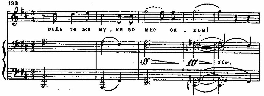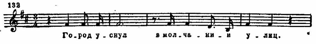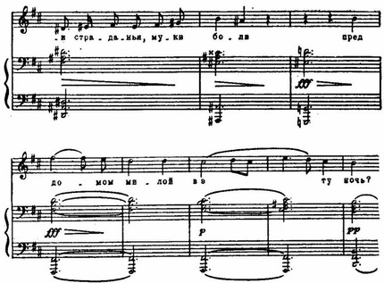 На фоне этого сопровождения настороженно, с затаенным волнением звучат приглушенные, часто обрывающиеся паузами фразы вокальной партии: