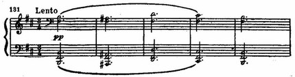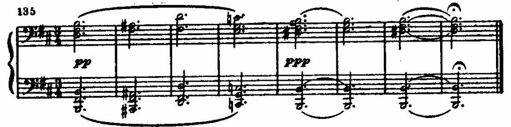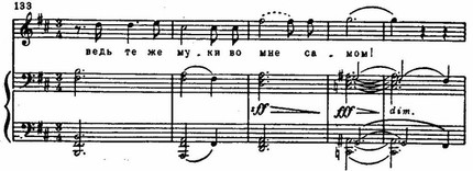В последнем построении (с такта 43) драматическое развитие вступает в завершающую фазу. Нарушается структурная замкнутость постоянного четырехтактного оборота. Каждый медленно ползущий по полутонам аккорд наделяется особой весомостью, значительностью. Вместе с тем они объединяются общим движением к dis-moll. Это смелое вторжение в чуждую тональную сферу вскрывает всю дисгармонию душевного состояния человека.