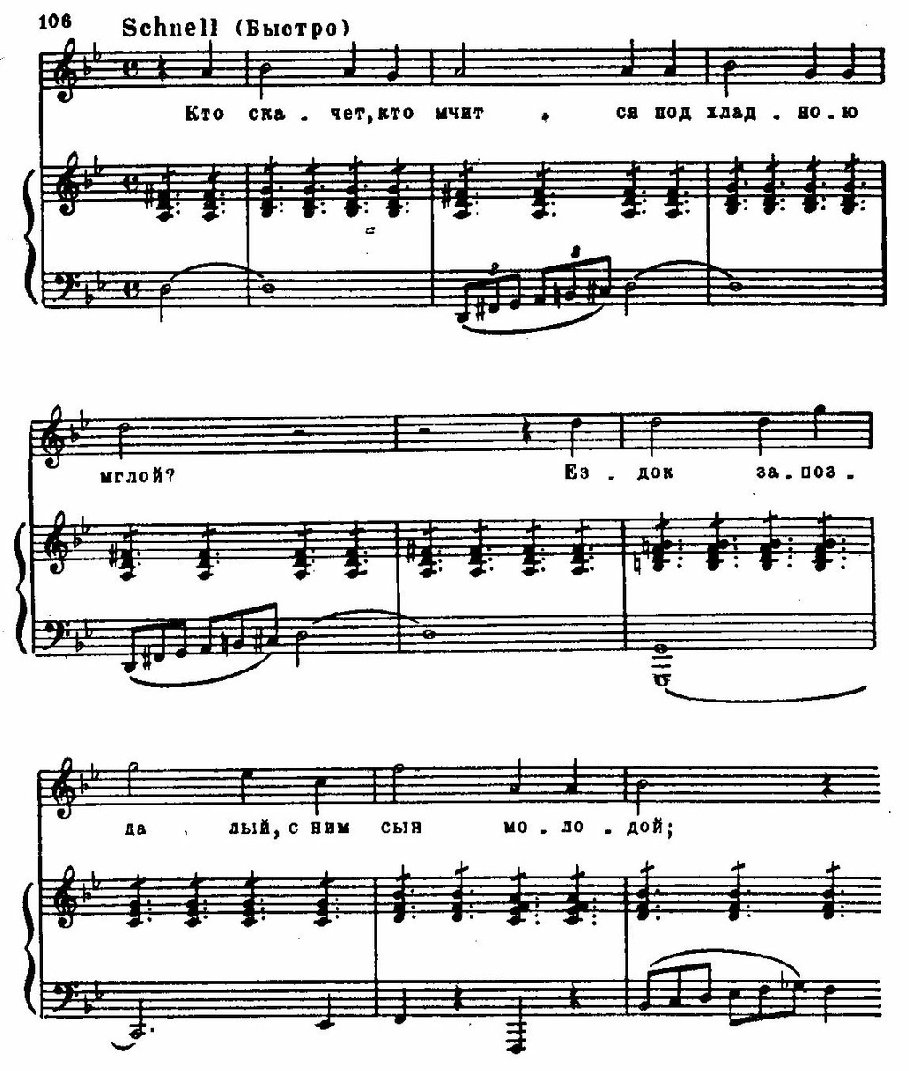 Но характерно для Шуберта, что сгущенную фантастичность картины «Лесного царя», мрачную ночь, бешеную скачку коня, бредовые видения умирающего ребенка он облекает в реальные образы действительного мира, отчего драматизм происходящего становится более ощутимым, остро впечатляющим.