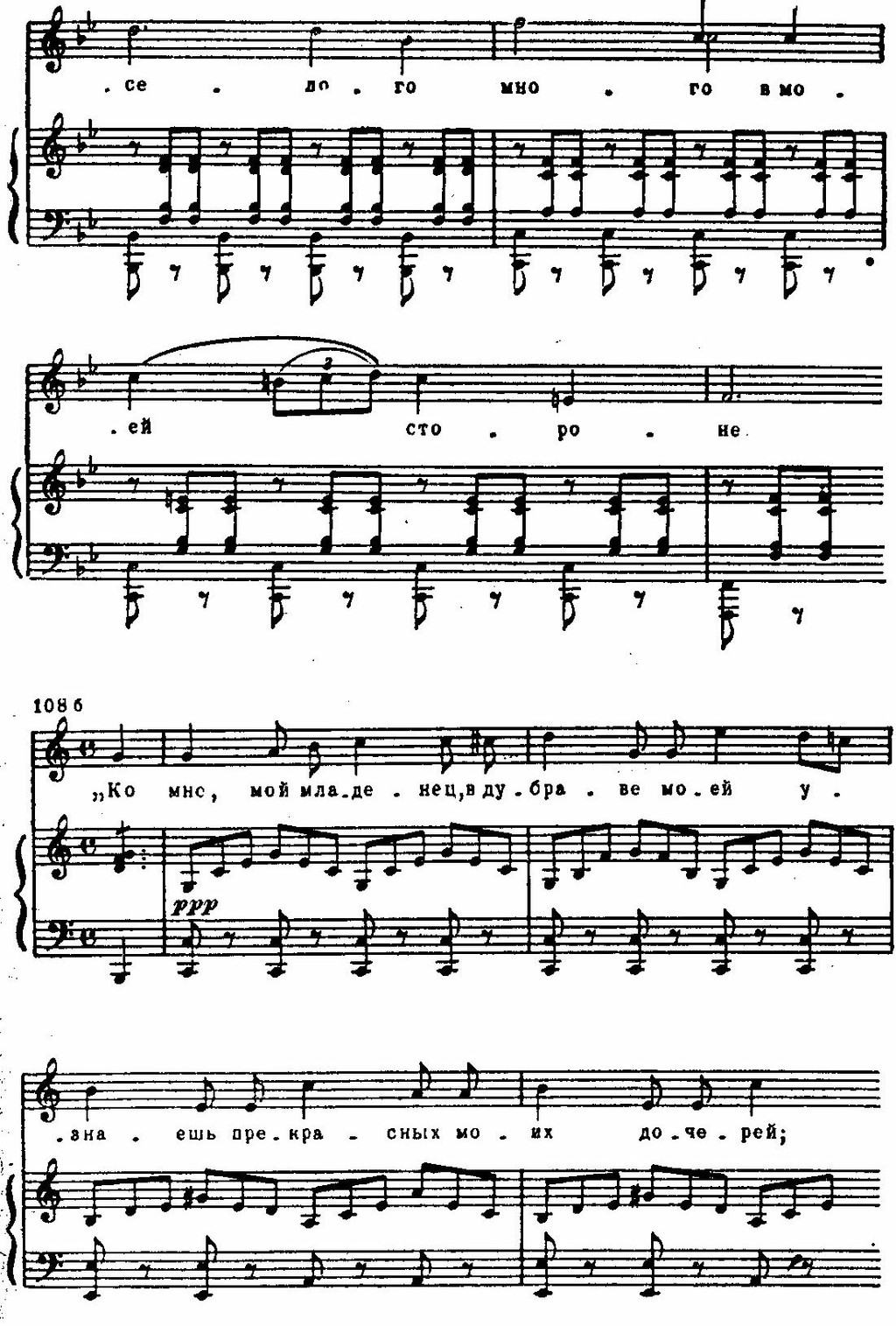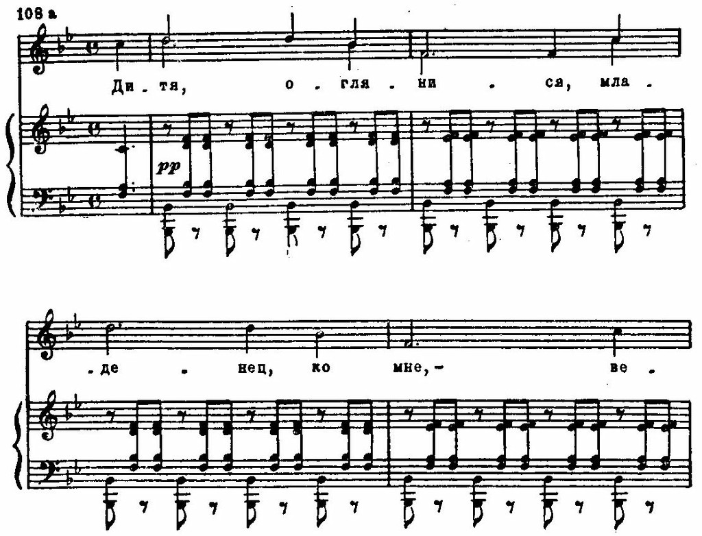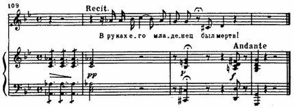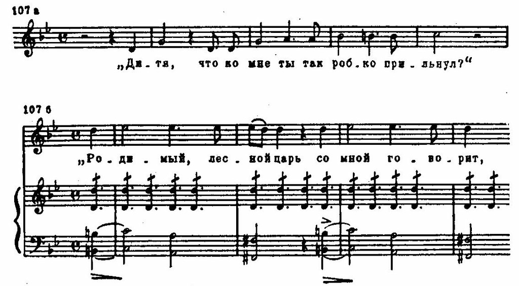 В партиях отца и ребенка драматизм чувств выражен усиленной хроматизацией мелодии, обострением речитативно-декламационных оборотов, напряженностью самой тесситуры, особенно в партии ребенка. Его фразы выделяет жесткая диссонантность малых секунд и нон, которые возникают от непрерывного «трения» вокальной мелодии и октавных репетиций в фортепианной партии: