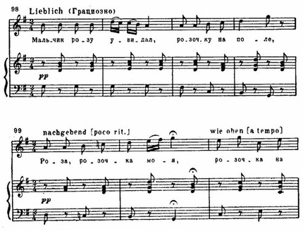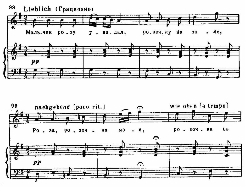 В песне «Полевая розочка» стихи и музыка достигли той редкой «абсолютной» тождественности, когда поэтический и музыкальный образ совершенно неотделимы и как бы перестают существовать один вне другого. И у Шуберта, и у Гёте — это детская песенка, которую можно принять за народную. Однако в стихотворении скрыт тонкий иронический подтекст, несколькими точными штрихами выявленный и, пожалуй, чуть усиленный Шубертом; предельная простота не исключает изысканности. Это сочетание отражается во всем: в общей структуре и изложении песни, в ее мелодическом и гармоническом рисунке.