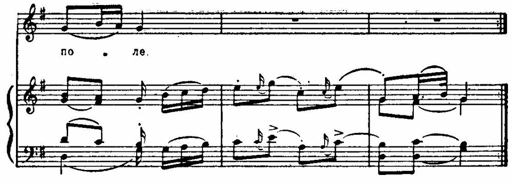 Так, шестнадцатитактовый куплет, лежащий в основе песни (всего три куплета), не совсем обычно членится; период из десяти тактов (запев) сменяется четырехтактовым припевом и двумя тактами фортепианного отыгрыша. Эта почти незаметная ассиметричность, вызванная легким передвижением граней внутри квадратной структуры, отражает пятистрочную строфу Гёте, подсказанную, вероятно, импровизационностью народного стихосложения. Примитивность фактуры аккомпанемента восполняется свежестью гармонического колорита, которую вносит субдоминантовая гармония (секундаккорд II ступени), тонко подменяемая во втором предложении отклонением в доминанту, активно «движущим» развитие к прерванному обороту с VI ступенью.