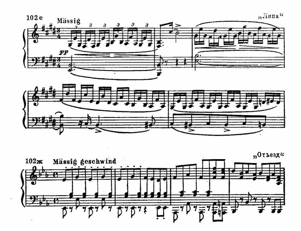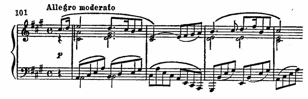 Трехчастная форма встречается и в его фортепианных «Экспромтах», «Музыкальных моментах» и даже — что казалось в то время особенно необычным — в темах сонатно-симфонических циклов (Таковы главные партии второй части «Неоконченной» или первой частя Девятой симфонии, фортепианных сонат B-dur, A-dur.).