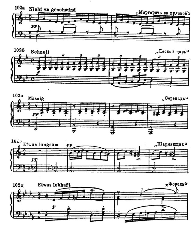 Так, в «Маргарите за прялкой» после двух вступительных тактов слушателя охватывает не только настроение тоски и грусти — он как будто видит и слышит прялку с ее жужжанием. Песня становится почти сценой. В «Лесном царе» — во вступительном фортепианном пассаже — взволнованность, страх и напряжение связаны с изобразительным фоном — торопливым стуком копыт. В «Серенаде» — любовное томление и бряцание струн гитары или лютни. В «Шарманщике» настроение трагической обреченности выступает на фоне наигрыша уличной шарманки. В «Форели» — радость, свет и почти ощутимый всплеск воды. В «Липе» тремолирующие звуки передают и шуршанье листьев, и состояние умиротворенности. «Отъезд», дышащий игривой самоудовлетворенностью, пронизан движением, которое вызывает ассоциации с всадником, кокетливо гарцующим на лошади: