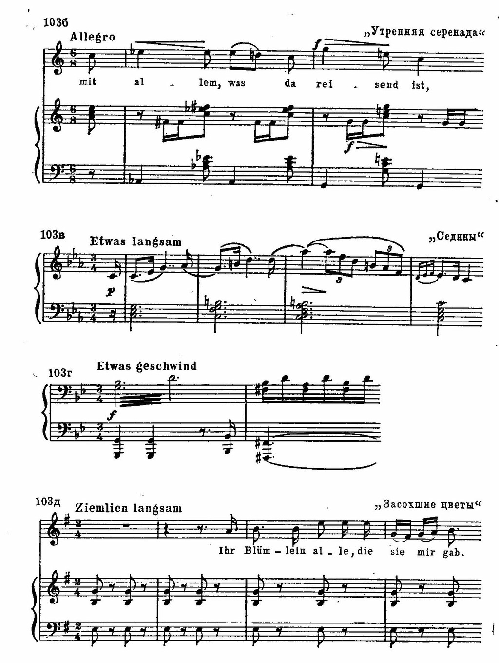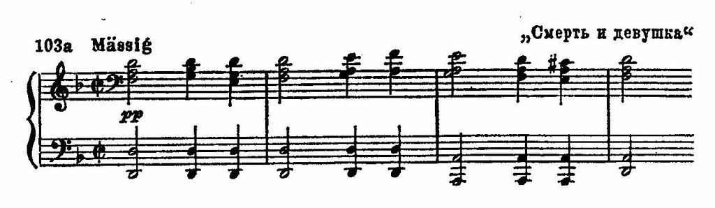 Сравним, например, народный танцевальный напев «гроссфатер» с оборотами шубертовской песни «Песнь издалека» или народную песню «Ум Любви» с песней Шуберта «Дон Гайзерос». В знаменитой «Форели» много общего с мелодическими оборотами народной песни «Убитый вероломный любовник»: