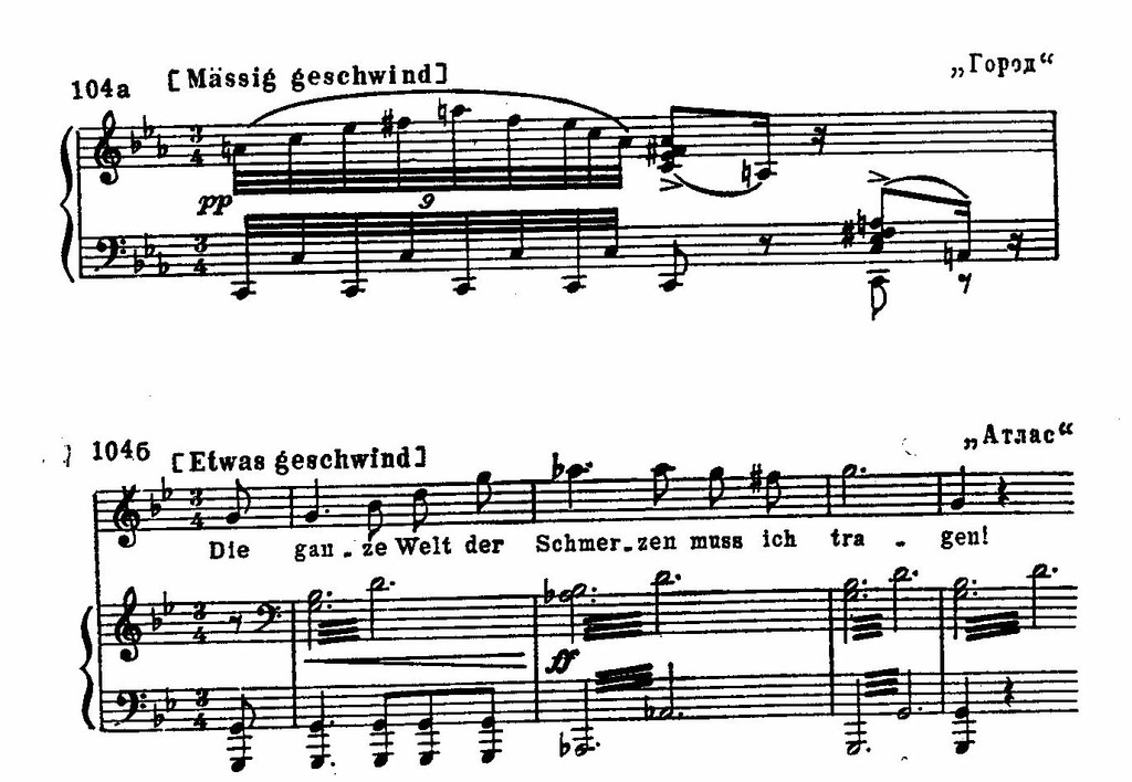 Трагические образы и новые музыкальные приемы «Зимнего пути» достигли еще большей выразительности в пяти песнях на тексты Гейне, сочиненных Шубертом в год смерти: «Атлас», «Ее портрет», «Город», «У моря» и «Двойник». Они вошли в посмертный сборник «Лебединая песня» (В сборник «Лебединая песня» входят семь песен на тексты Рельштаба, одна — на текст Зейдля, шесть — на текст Гейне.).
