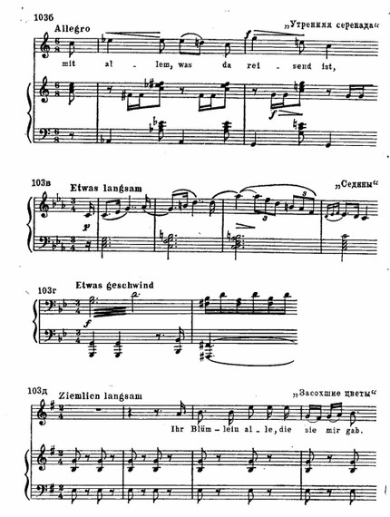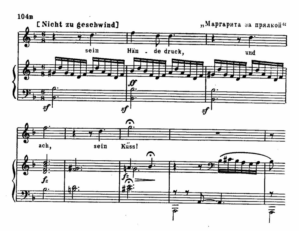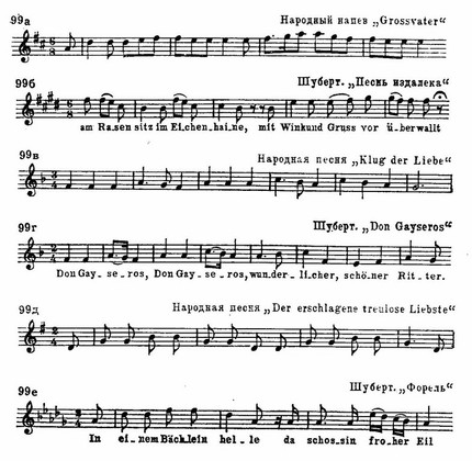 Подобные примеры можно было бы умножить. Но вовсе не подобными явными связями определяется народно-национальный характер шубертовской мелодии. Шуберт мыслил в народно-песенном стиле, это был органический элемент его композиторского облика. И мелодическое родство его музыки с художественным и интонационным строем народного искусства воспринимается на слух еще более непосредственно и глубоко, чем при помощи аналитических сопоставлений.
