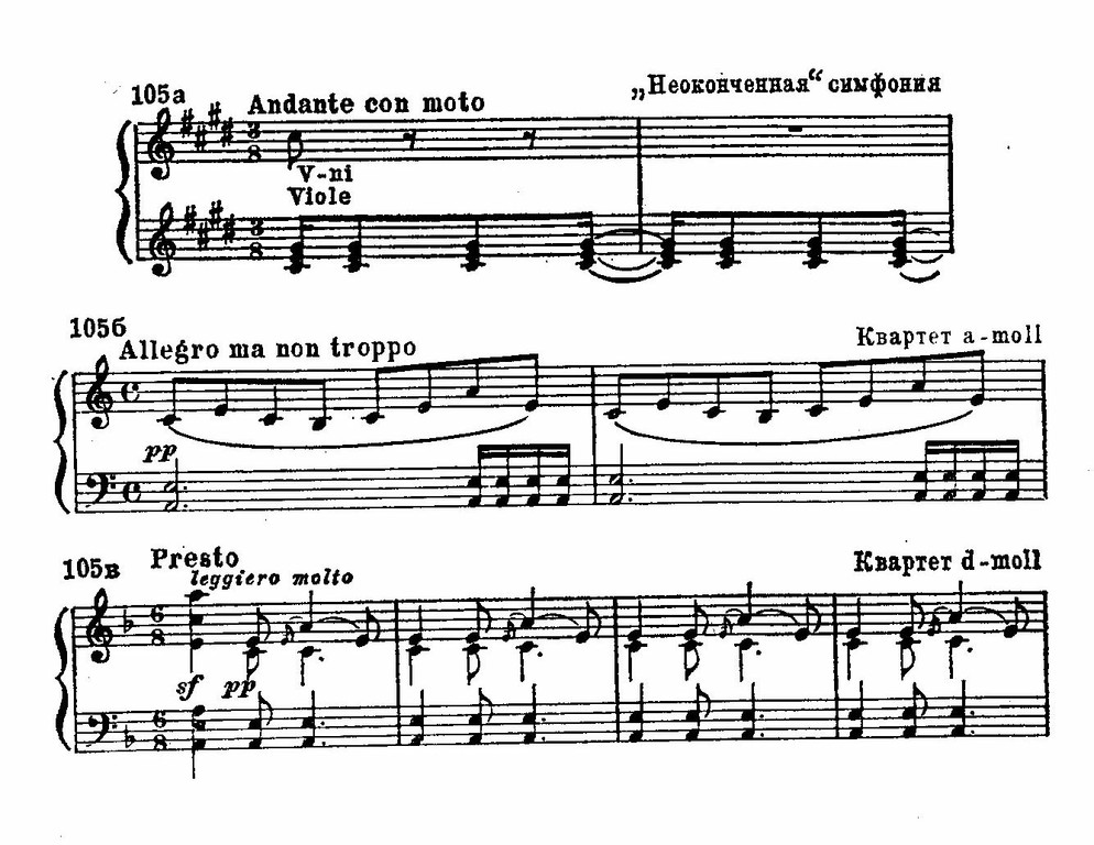 Аккомпанементы Шуберта пианистичны от первой до последней ноты. Их нельзя представить себе в каком-либо ином тембровом звучании. (Только в самых ранних - «кантатных» - песнях Шуберта сопровождение напрашивается на оркестровое переложение.) О фортепианной природе шубертовских аккомпанементов ярче всего говорит тот факт, что Мендельсон при создании своих знаменитых «Песен без слов» для рояля откровенно опирался на их стиль. И тем не менее именно к партии сопровождения восходят многие черты симфонических и камерно-инструментальных тем Шуберта. Так, в «Неоконченной симфонии» в главных и побочных темах (примеры 121 и 122), в побочной теме второй части, в главной теме a-moll’ного квартета, в заключительной теме d-moll’ного квартета и во многих других колористический фон, подобно фортепианному вступлению к песне, создает определённое настроение, предваряя появление собственно темы: