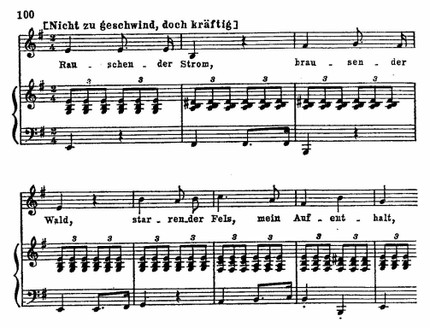 Обычно, если только это не песня балладного типа (подробнее об этом см. ниже), фортепианная партия строится на неизменно повторяющемся мотиве. Подобный архитектонический прием — условно назовем его «остинатной повторностью» — восходит к танцевальной ритмической основе, характерной для народной и бытовой музыки многих европейских стран. Он придает песням Шуберта большую эмоциональную непосредственность. Но Шуберт насыщает эту равномерную пульсирующую основу остро выразительными интонациями. Для каждой песни он находит свой неповторимый мотив, в котором лаконичными, характерными штрихами выражено и поэтическое настроение, и изобразительная канва.