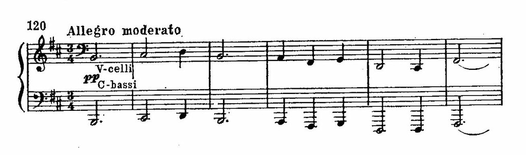Тема побочной партии, звучащая в глубоком тембре виолончелей, отличается редким мелодическим обаянием. Она связана с венской бытовой песней многими своими выразительными деталями (начиная с пульсирующего синкопированного фона и кончая структурной симметрией по схеме АВВА):