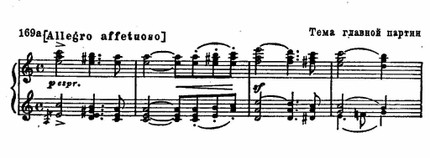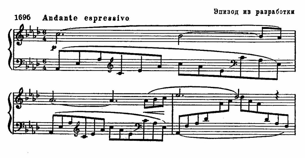 В первой части с большой художественной убедительностью осуществлен прием обогащения сонатной формы принципами вариационного развития. Главная тема, многократно трансформируясь, показана в разнообразных аспектах. Сравним, для примера, главную тему с контрастирующим эпизодом из разработки — мечтательная As-dur'ная тема, с ее характерным для романтического пианизма педальным звучанием, является мелодическим вариантом первой: