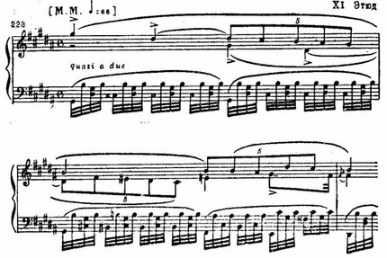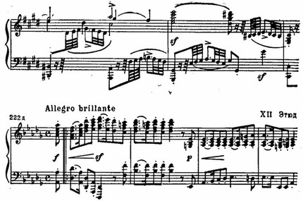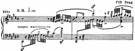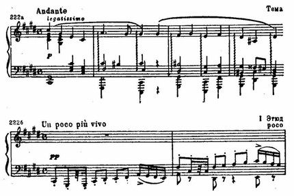 В десятом этюде сохраняется не только гармония темы, но и ее мелодические звуки на сильных долях и даже на относительно сильных. Шестнадцатые придают особую энергию.