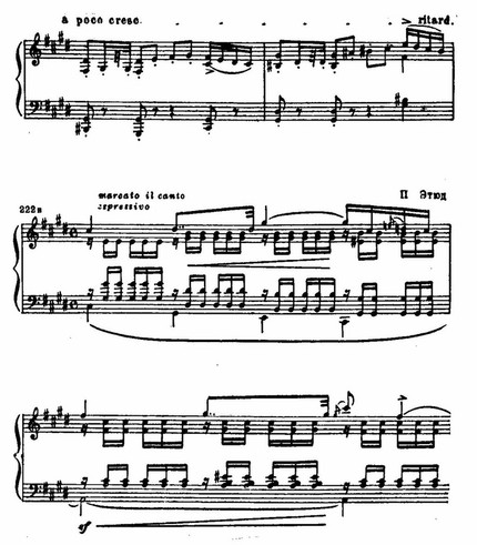 Третий этюд связан с темой весьма отдаленно – лишь во втором такте в среднем голосе возникает интонация темы. На первый план выходит тональность, прежде занимавшая подчиненное положение – ми мажор.