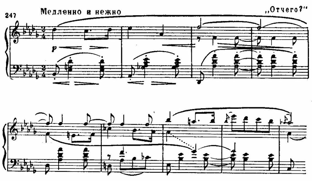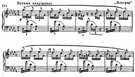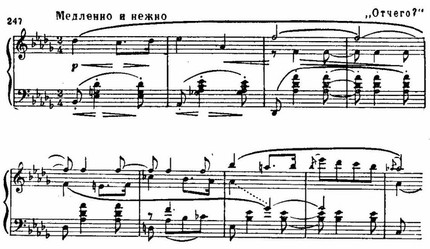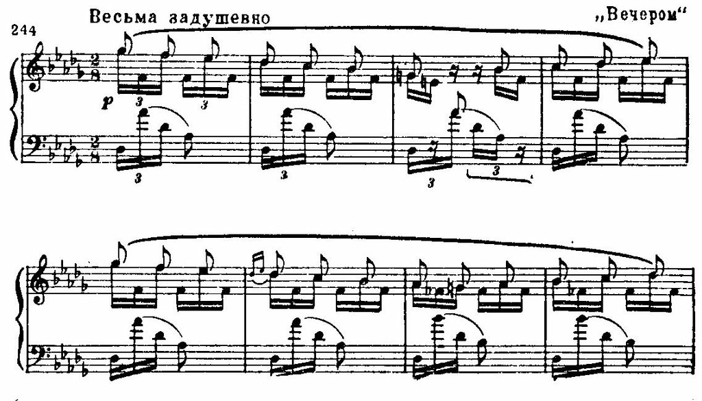 Самое же «шумановское» заключается, пожалуй, в теснейшем взаимодействии всех пластов музыкальной ткани, насквозь проникнутой мелодическими голосами. Фактура насыщена интонационной выразительностью, и из самого фона словно рождается мелодия, она нередко «прячется» в волнах общего движения. Эта чисто романтическая фактура таит в себе своебразную полифоничность. Она присутствует и в пьесах «Вечером» и «Ночью», и в тончайшей миниатюре «Отчего?», где дополняется имитациями, усиливающими настроение романтического томления, неразрешенного вопроса: