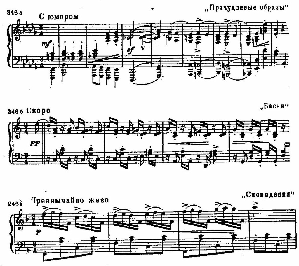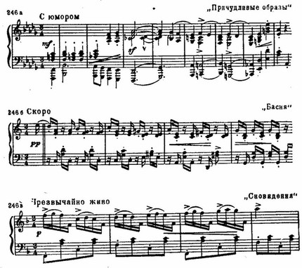 В пьесе «Вечером» очень тонко переданы те неуловимые чувства, которые навевает умиротворенное созерцание вечерней природы. Дуоли в правой руке, сопровождающие размеренную мелодию с преобладанием поступенного движения, изложены таким образом, что в них вырисовываются очертания триолей, и добавление настоящих триолей в левой руке создает впечатление зыбкости и легкости. В противоположность этому, пьеса «Ночь» заполнена тревожными взлетающими и ниспадающими шестнадцатыми – эти «волны» не утихают даже в моменты кажущегося успокоения (тревожная ночь без сна). Близок к этой пьесе по образному строю «Порыв» – еще более страстный благодаря повторяющемуся «вопросу без ответа» в тяжелой аккордовой фактуре. Этим бурным чувствам противопоставляется причудливая фантастичность «Сновидений», тонкое остроумие «Причуды», сопоставление эпичности и стремительности в «Басне».