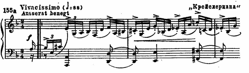 Новым в ритмах Шумана представляется и прихотливость темпа, отражающего колебания душевных состоянии. Непрерывное нарастание, безудержное stringendo в конце произведения становится даже одним из стилистических признаков шумановской фортепианной музыки в крупных формах (см. Первую и Вторую фортепианные сонаты, «Фантазию», концерт). В этом проявляется пристрастие к свободным ритмам романтиков как к одному из выразительных средств в передаче возбужденных, неустойчивых состояний.