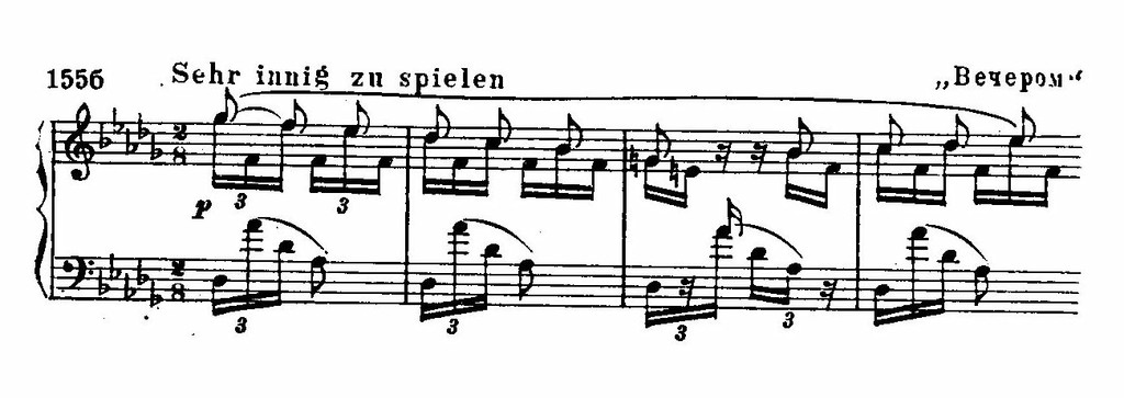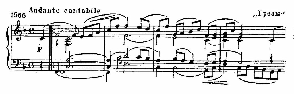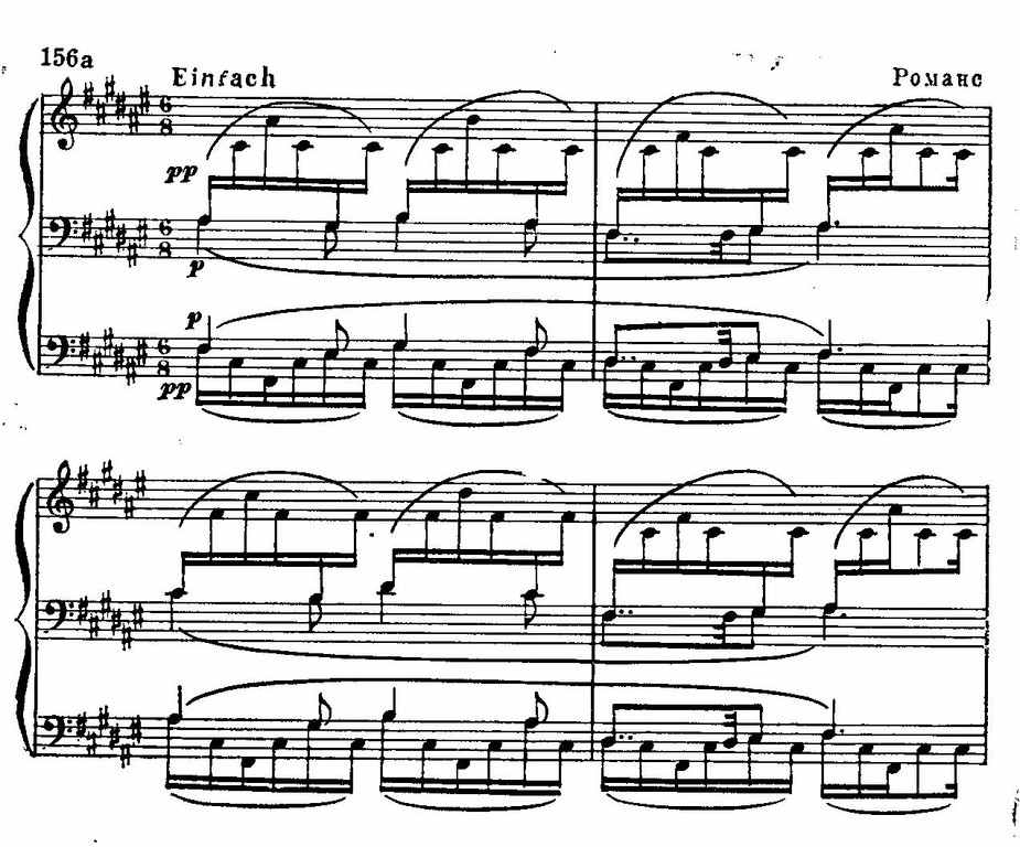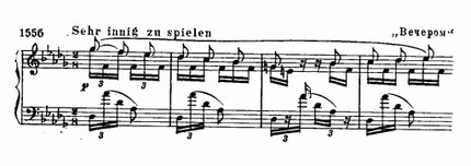 В высшей степени своеобразна мелодика Шумана. В его фортепианных произведениях неоднократно встречаются закругленные песенные темы в «шубертовской» манере. См., например, тему «Романса» Fis-dur или «Грез». В «Романсе» плавная поющая мелодия, как бы отдаленная от гармонического фона и противопоставляемая ему, вызывает яркие ассоциации с вокальной музыкой в оперных и народно-песенных традициях: