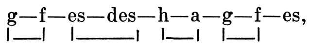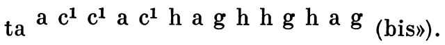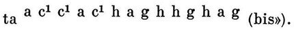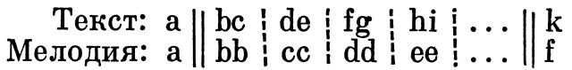 Основу формы составляли двойные стихи (bc, de, fg,…), строки к-рых точно или приблизительно равны по длине (одна нота — один слог), иногда родственны по содержанию; пары же строк часто контрастны. Наиболее примечательна арочная связь между всеми (или почти всеми) окончаниями муз. строк-либо на одном и том же звуке, либо даже сходными заключит. оборотами.