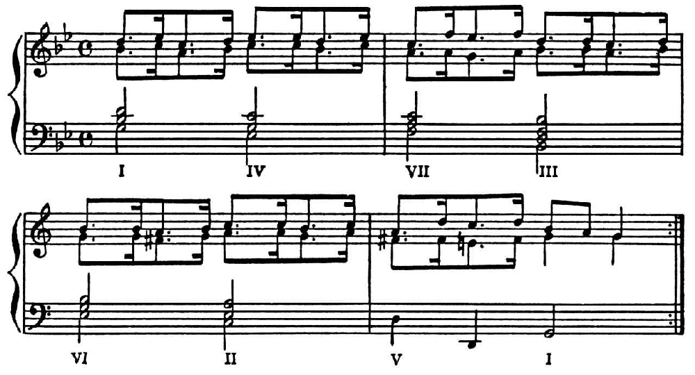 С. с движением по квинтам вверх (плагальная) встречается редко (см., напр., 18-ю вариацию «Рапсодии на тему Паганини» Рахманинова, такты 7–10: V–II, VI—III вв. Des-dur). Сущностью С. является линеарно-мелодическое движение, в к-ром определяющее функциональное значение имеют его крайние точки; внутри средних звеньев С. преобладают переменные функции.