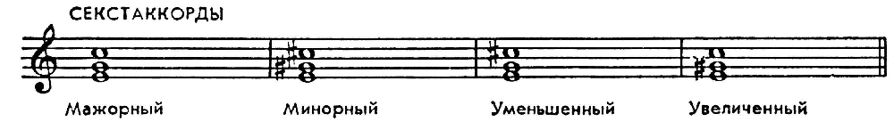 Мажорный секстаккорд состоит из интервалов малой терции и чистой кварты, минорный секстаккорд — из большой терции и чистой кварты, уменьшенный секстаккорд — из малой терции и увеличенной кварты, увеличенный секстаккорд — из большой терции и уменьшенной кварты. Увеличением секстаккорда наз. также альтерированный секстаккорд с увеличенной секстой. См. Аккорд, Обращение аккорда.