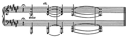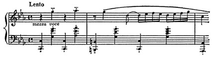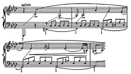 Реже активизация метра и темпа достигается запаздывающими С. (напр., увертюра «Кориолан» Бетховена, гл. партия увертюры П. И. Чайковского «Ромео и Джульетта»). В романтич. музыке часто встречаются С. противоположного, «рубатного» характера. Ритмич. диссонансы при этом иногда остаются без разрешения (напр., в окончании пьесы Листа «Bénédiction de Dieu dans la solitude» для фп.):