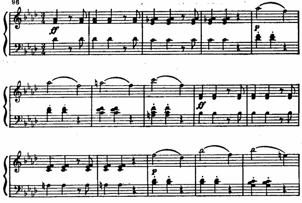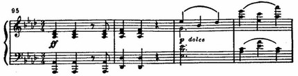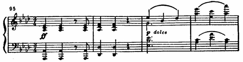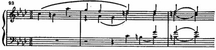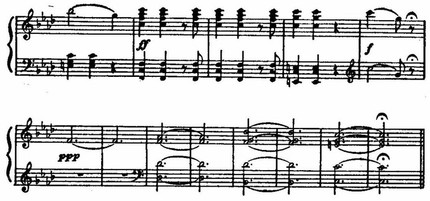 Вторичное проведение тем еще сильнее подчеркивает их контрастность. Правда, следующий эпизод в какой-то степени затушевывает остроту конфликта. Мягкая лирическая мелодия словно парит плавно и свободно. Но глухо доносятся удары баса — это отзвуки темы сарабанды, в них слышится скрытая угроза. И чем ниже спускается мелодия, тем угрюмее становится «стучащий» ритм сарабанды.