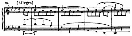 В целом Allegro охвачено стремительным движением, непрерывно нарастающая динамика скрадывает грани отдельных разделов формы. В результате — экспозиция, разработка, реприза оказываются накрепко слиты. (Немаловажен при этом тональный план сонатного allegro. Закономерная для разработки тональная неустойчивость не получает в репризе требуемого разрешения и утверждения основной тональности. В репризе побочная партия проходит в Des-dur, который для f-moll как главной тональности является субдоминантой (тональностью VI ступени). Разрешение тонального конфликта, как и всех остальных, сдвинуто в коду.) Трагическая кульминация, очевидно, совпадающая с моментом гибели героя, отнесена в конец репризы.