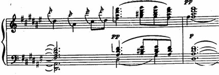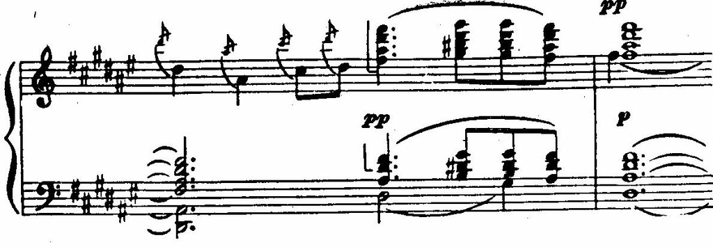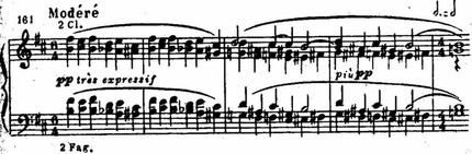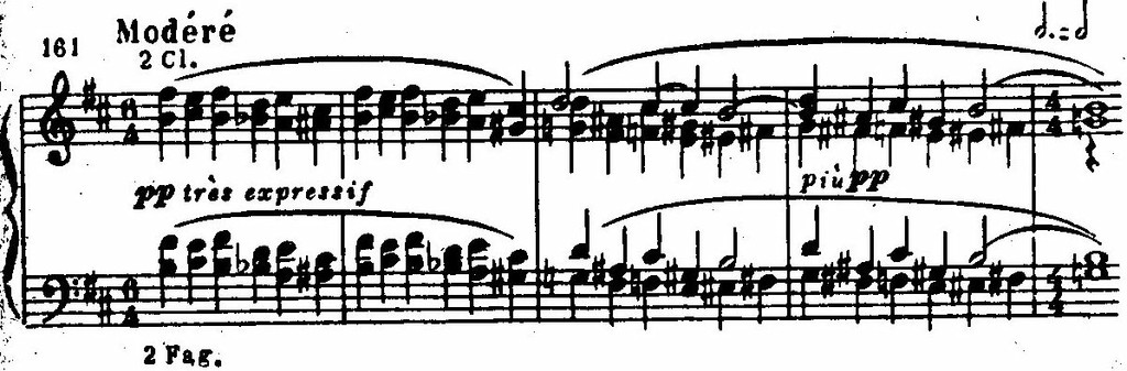Начало «Облаков» как раз и воссоздает живописный образ бездонной глубины неба с его трудно определимым цветом, в котором причудливо смешиваются разнообразные оттенки. Одна и та же поступенная, как бы колышущаяся последовательность из квинт и терций у двух кларнетов и двух фаготов не меняет на длительном протяжении своего ровного ритма и выдерживается в почти бесплотной тончайшей звучности: