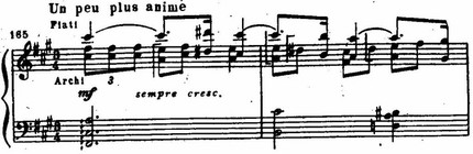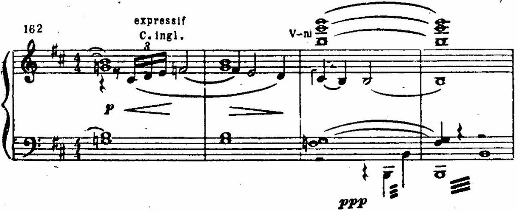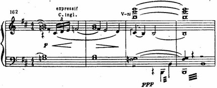 Появление в пятом такте более яркого мелодического «зерна» у английского рожка, с его характерным «матовым» тембром, воспринимается лишь как слабый намек на тему, которая на протяжении всей первой части почти не меняет своего мелодического рисунка и тембровой окраски: