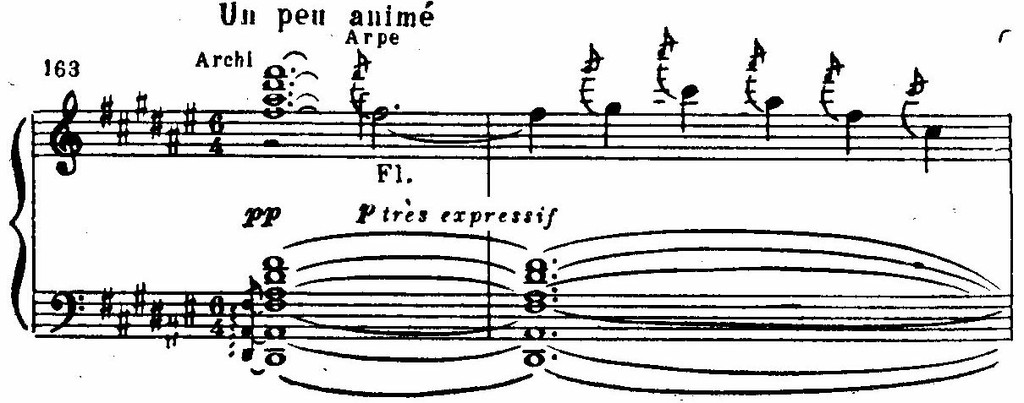 Пристрастие композитора к «чистым» тембрам на этот раз уступает место тонко смешиваемым оркестровым краскам (звучание темы у английского рожка с кларнетом сменяется проведением ее у флейт с гобоями, затем у виолончелей с фаготами). В гармоническом сопровождении появляются мажорные трезвучия отдаленных тональностей и цепочки нонаккордов (напоминающих густо наложенный мазок на живописном полотне). В одном из проведений темы ее мелодический рисунок основан на целотонной гамме, что придает ей новый ладовый оттенок (увеличенного лада), часто используемый Дебюсси в сочетании с мажором и минором.