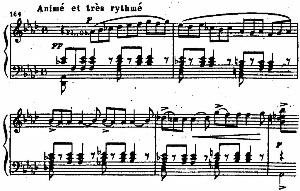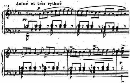 На этом колоритном фоне появляется основная тема первой части «Празднеств», напоминающая тарантеллу. Мелодия ее строится на поступенном движении с многочисленными опеваниями опорных звуков, но типичный для тарантеллы триольный ритм и быстрый темп придают легкость и стремительность движению темы: